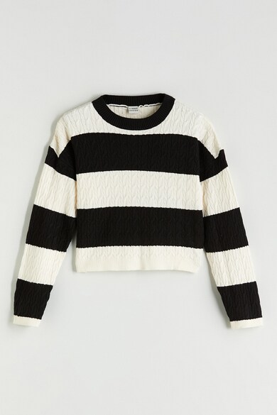 Csavart kötésmintás csíkos pulóver, Fehér, Fekete,