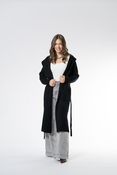 Kapucnis hosszú kardigán megkötővel a derékrészen, Fekete,